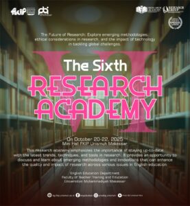 Makassar — Program Studi Pendidikan Bahasa Inggris, Fakultas Keguruan dan Ilmu Pendidikan (FKIP) Universitas Muhammadiyah Makassar kembali menggelar Research Academy VI yang akan berlangsung pada hari Senin hingga Rabu, 20–22 Oktober 2025 mendatang di Mini Hall FKIP Unismuh Makassar. Kegiatan tahunan ini mengusung tema “The Future of Research: Explore Emerging Methodologies, Ethical Considerations in Research, and the Impact of Technology in Tackling Global Challenges.”